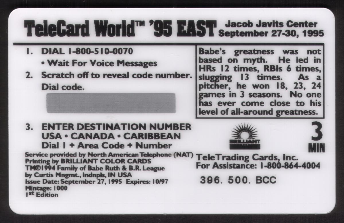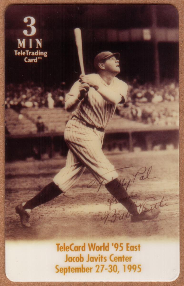 This item commemorates Babe Ruth and the 1995 Jacob Javits Expo, associating with sports legends and baseball memorabilia, placing it among collectible phone cards featuring historic baseball imagery.