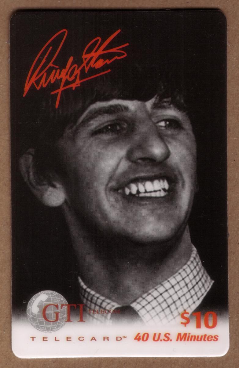 Black-and-white Ringo Starr portrait with red signature, $10 value, 40 U.S. minutes, GTI branding, collectible tribute to The Beatles icon. |