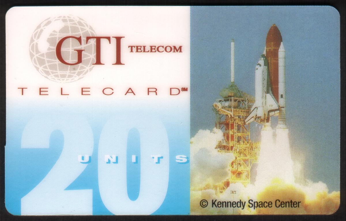 GTI Telecom TELECARD featuring a NASA Shuttle launch at Kennedy Space Center, valued at 20 units, highlighting space exploration, engineering, and Florida tourism. |