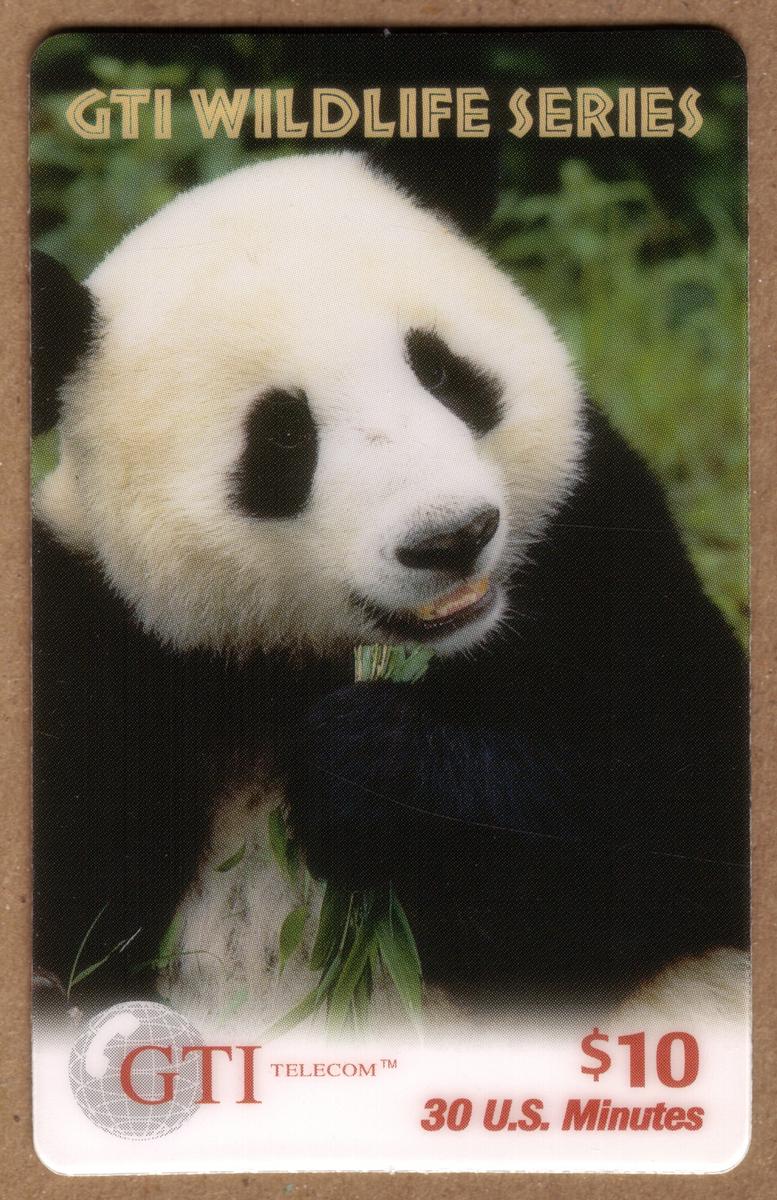 The top left corner of the card has text reading “$10,” indicating the card’s value. Just below this, the words “Wildlife Series: Panda” are prominently displayed in white capital letters on a dark green background. On the upper right corner, the name “GTI Telecom, Inc.” appears in small print with a triangular logo featuring the letters “GTI” inside a gold and black shape.