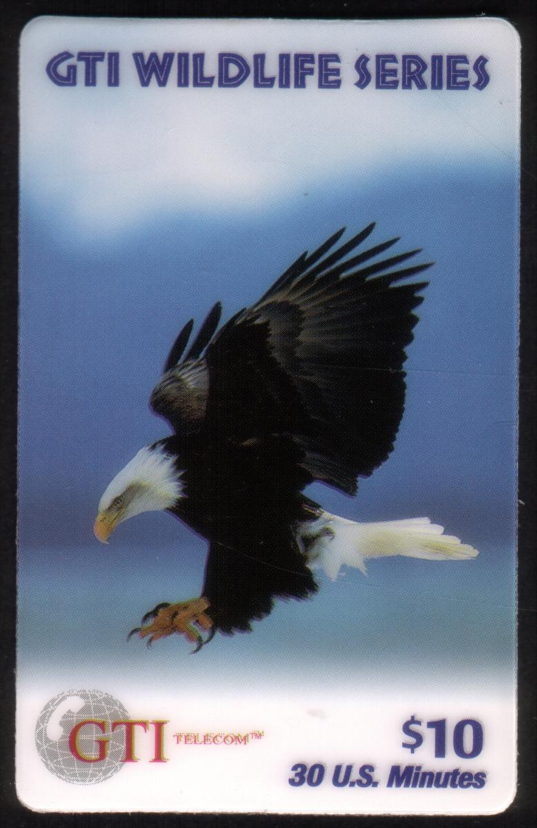 Text on the card identifies it as part of the “Wildlife Series: Bald Eagle” with a $10 value indicated. The card includes the words “American Bald Eagles,” “American symbols,” “American symbolism,” “Americana,” and “American national emblem,” underscoring the cultural significance of the eagle in the United States. The card also features the name “GTI Telecom, Inc.” and is marked “SAMPLE,” which signifies its status within the series produced by the company.