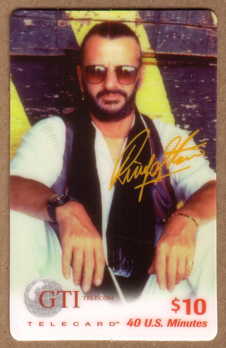 Ringo Starr collectible prepaid phone card with $10 value, 40 U.S. minutes, featuring his image, autograph, urban background, and GTI Telecom branding. |