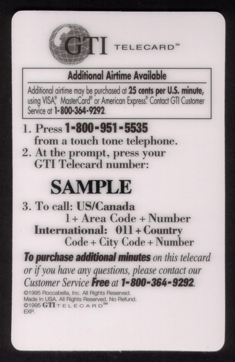 The card’s value is $10 and it provides 40 U.S. minutes for use. The GTI Telecom logo appears near the bottom left, alongside the word "TELE CARD" and the specified minute allotment. The telecard was produced in 1995 as a sample.