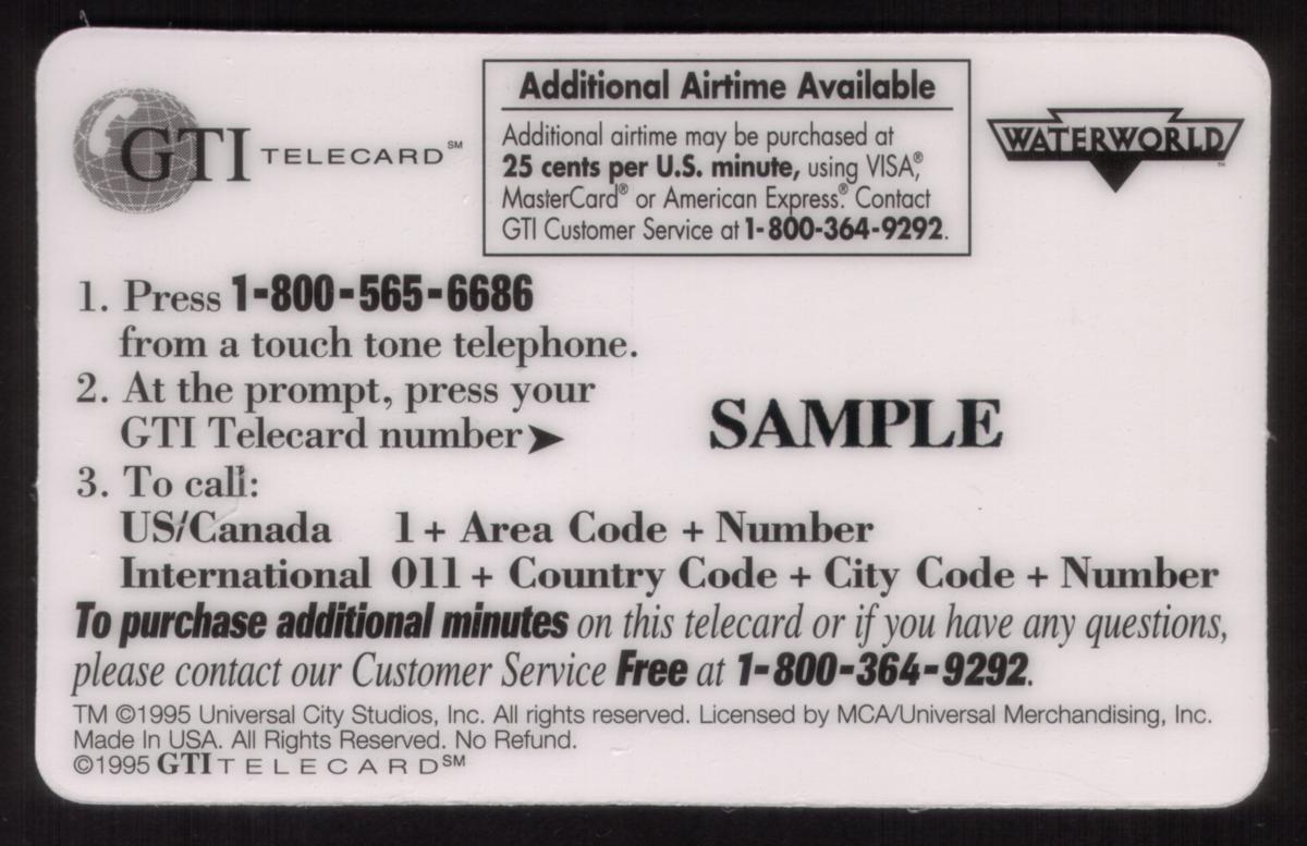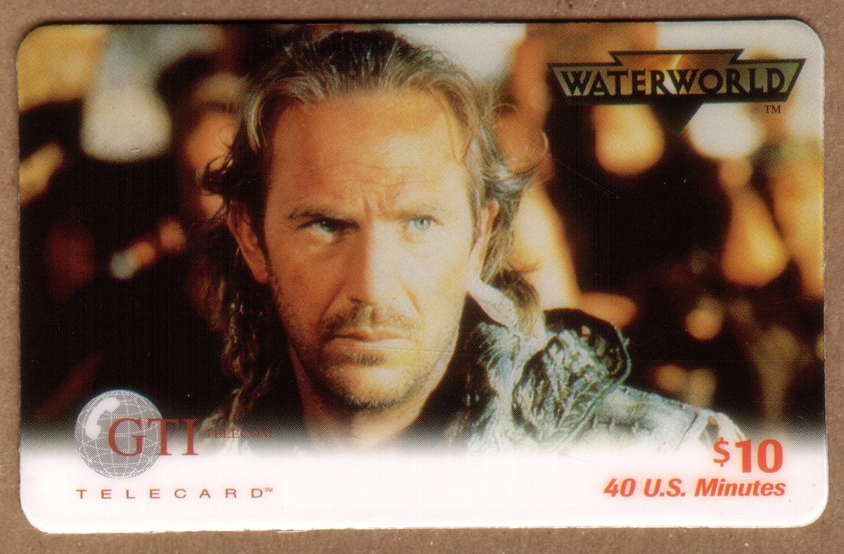 This item is clearly linked to entertainment and Hollywood, specifically the "Waterworld" movie series, and is issued by GTI Telecom, Inc. as a telecard providing 40 minutes of call time for $10.
