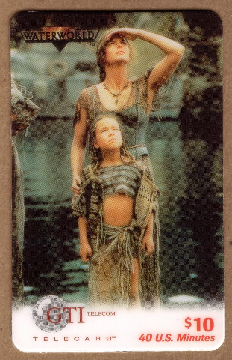 Waterworld 1995 film scene with Jeanne Tripplehorn and Tina Majorino, featuring muted aquatic tones, official logo, $10 value, and telecom branding. |