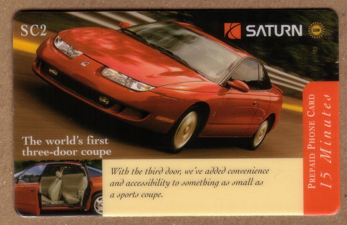 This collectible promotional card features the 15m Saturn SC2 Three-Door Coupe, highlighting Saturn automobiles as a theme. The card prominently displays logos and trademarks associated with Saturn and its parent corporations. The design emphasizes Saturn’s distinction as the world’s first manufacturer of a three-door coupe, focusing on automotive transportation. The card includes promotional elements and corporate branding typical of advertisements related to Saturn vehicles.