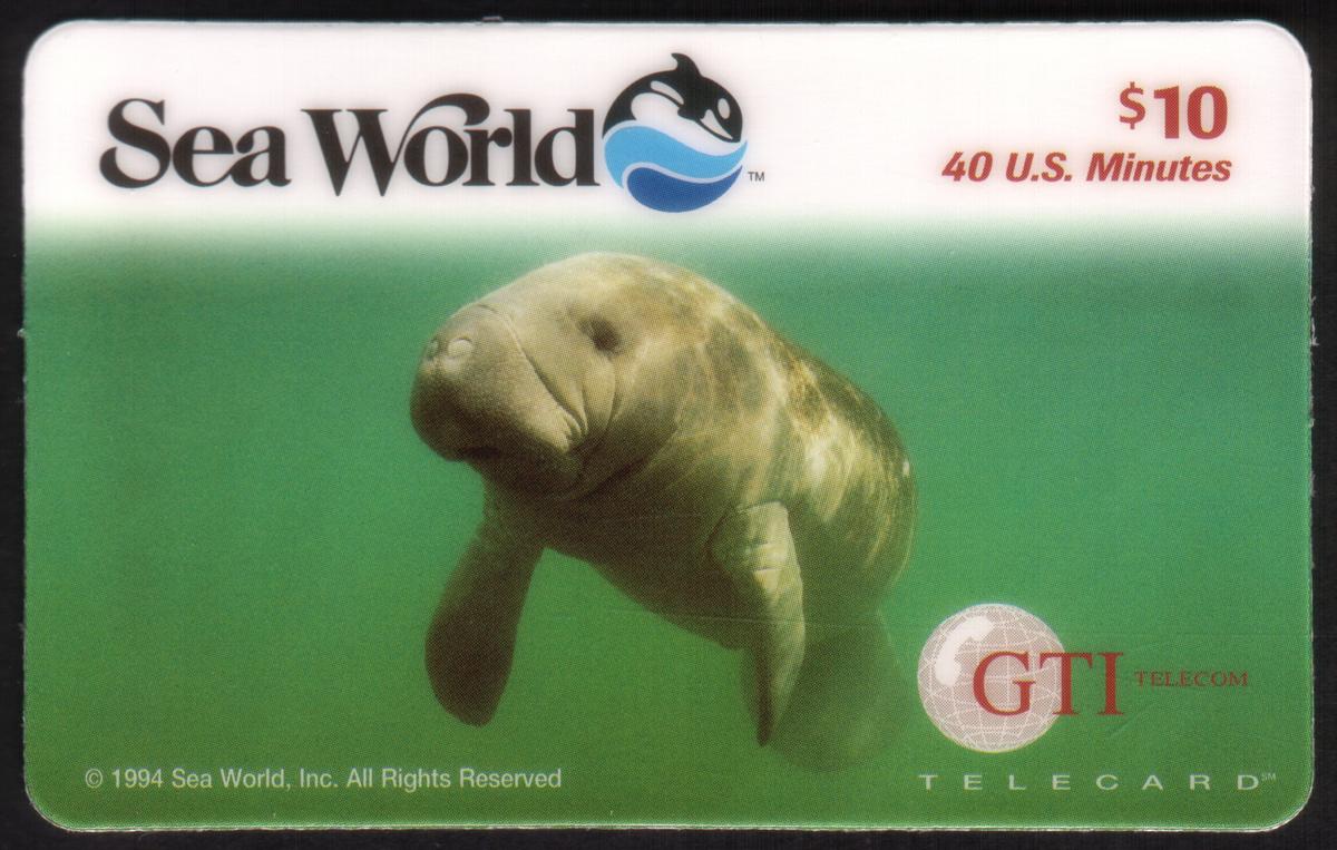 This collectible phone card from 1994 features a vibrant illustration of a manatee, an aquatic mammal native to Florida’s coastal waters, set against a lush underwater scene. The card highlights Sea World Orlando, a popular Florida attraction known for its marine life exhibits and shows. The manatee appears in soft, natural colors, surrounded by aquatic plants and gentle water currents, emphasizing the peaceful nature of this endangered species.