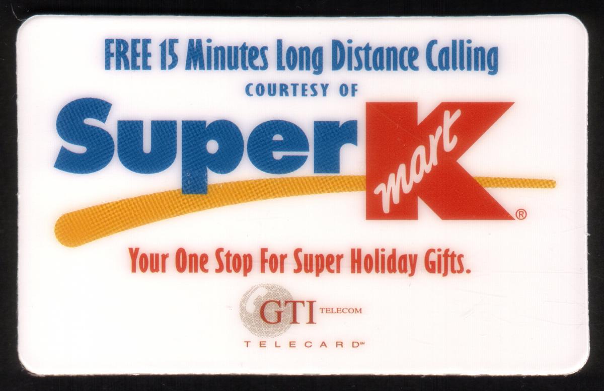 This collectible phone card features promotional branding for K-mart, showcasing their slogan "Your One Stop For Super Holiday Gifts." The card prominently displays the K-mart logo along with the "15m Super Kmart" text, indicating its association with K-mart’s promotional campaign. The design includes consumerism themes tied to shopping and holiday gift-giving.