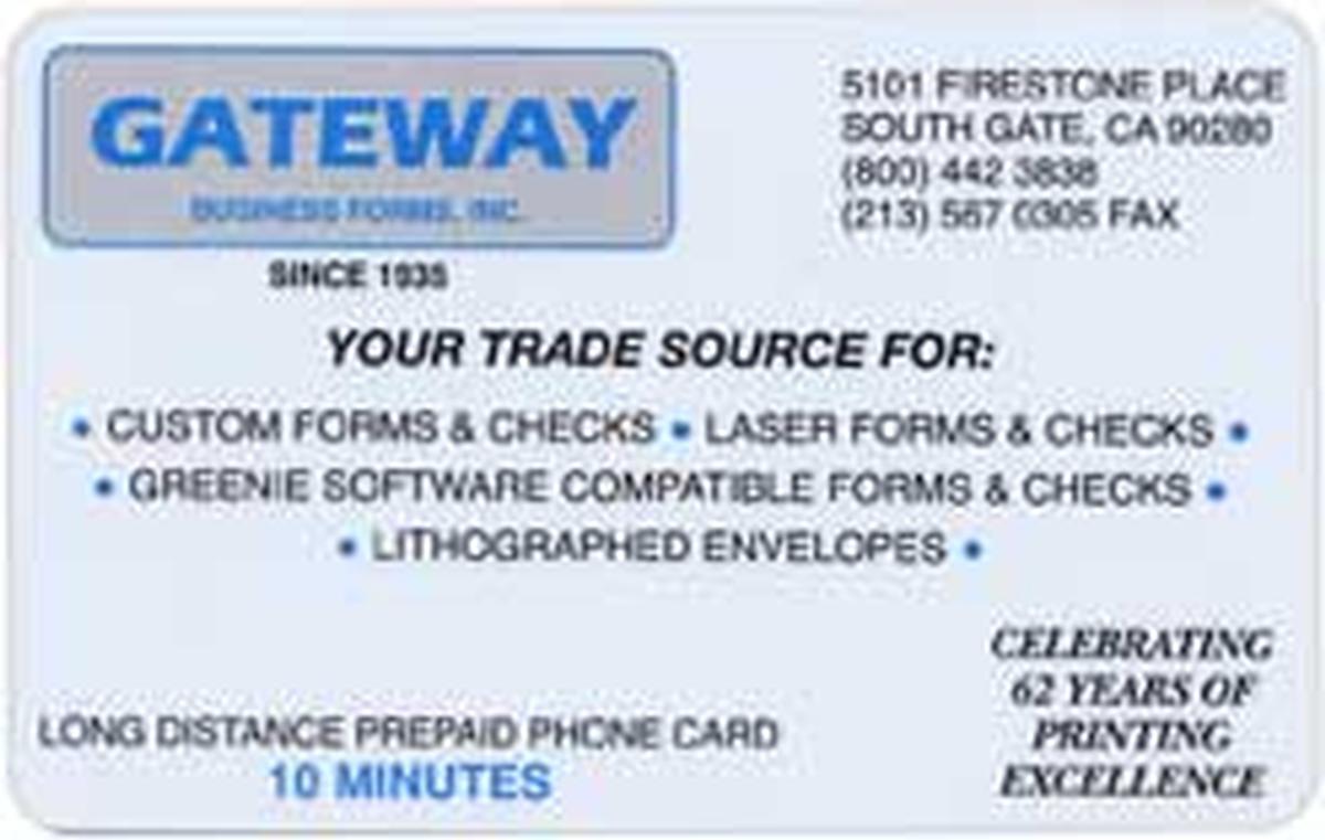 This item serves as a promotional business card related to the printing and corporate forms industry, with a focus on Gateway Business Forms and LDDS WorldCom, marking its association with South Gate, California, and highlighting Don E. Hunt Sr’s involvement in these corporate endeavors.
