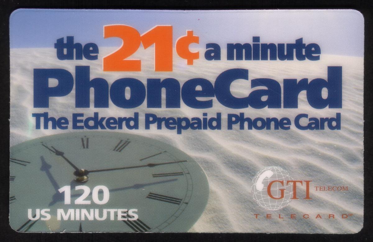 Text on the card includes the denomination "21 cents a minute" and the company names "Eckerd" and "GTI Telecom, Inc." There is no imagery beyond the logos and stylized text. The card is intended for telecommunications use and collected as a sample phone card, demonstrating the service rate and duration available for calls.