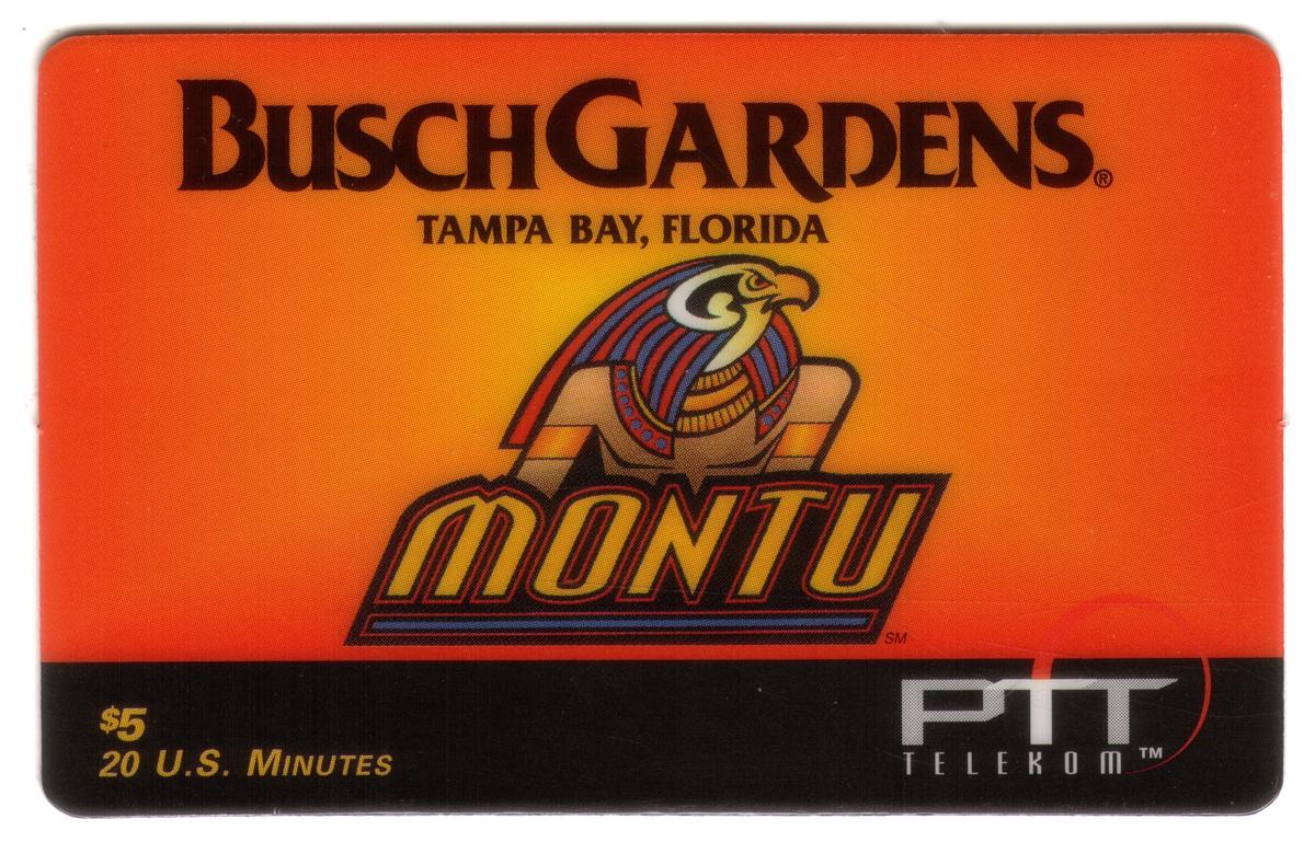Overall, this phone card serves as a collectible item centered on the popular Montu ride at Busch Gardens, combining entertainment, thrill rides, and travel in one vivid presentation.
