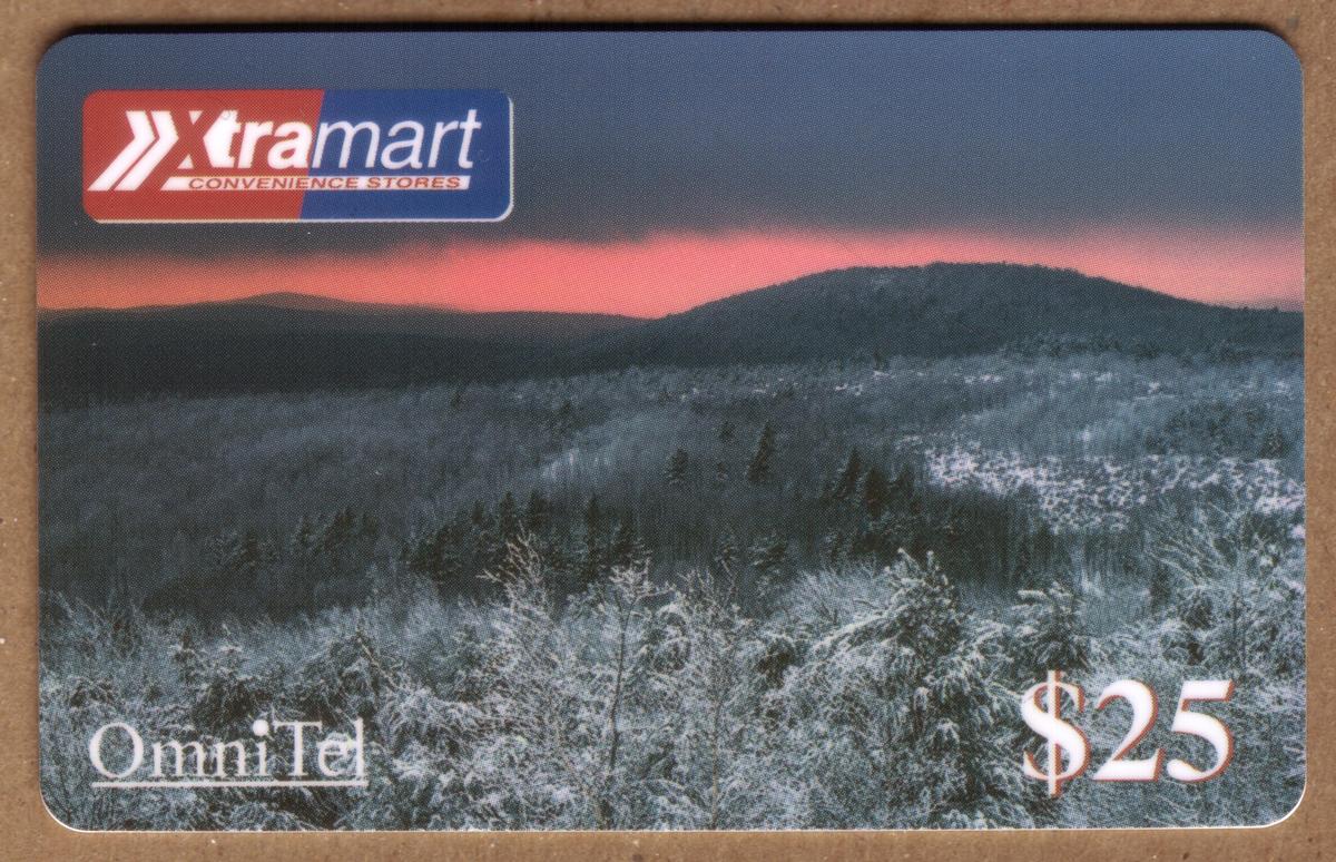 The card is issued by OmniTel and has a $25 value, with branding from Xtramart Convenience Stores clearly visible. The natural elements and mountain scenery evoke a calm and serene atmosphere, consistent with a winter sunset in a mountainous region. The overall presentation emphasizes the beauty of nature with vivid colors representing the sunset and surrounding flora.