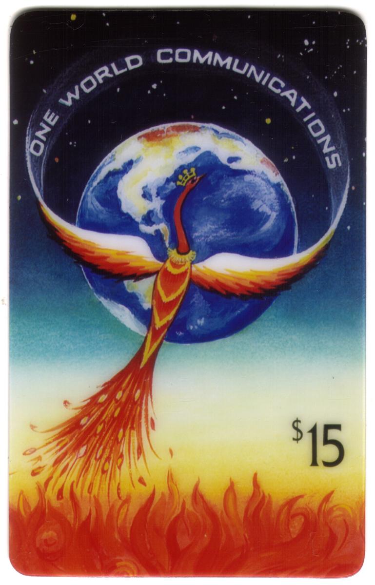 At the top of the card face, the text reads "Phoenix. Artwork of Peacock Embracing The World," reinforcing the theme of unity and connection between wildlife and Earth. The card also includes the inscription "One World Communicat," emphasizing a message of global communication or unity. The value of the card is marked as "$15," indicating its monetary denomination.