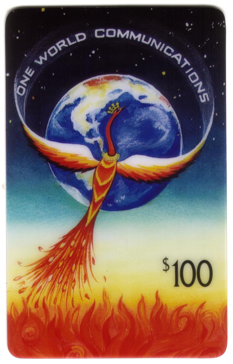 The card includes the text “Face Phoenix” and bears the denomination of $100, indicating its value. The design incorporates elements of world, earth, globes, planets, birds, animals, and bird feathers, blending these together in a fantasy painting style. The card is clearly marked as associated with WorldCom, linking it to this entity.