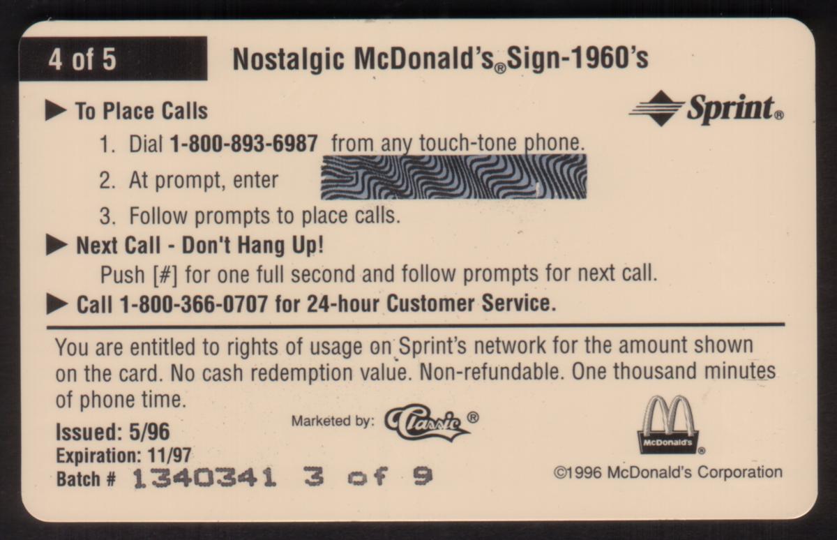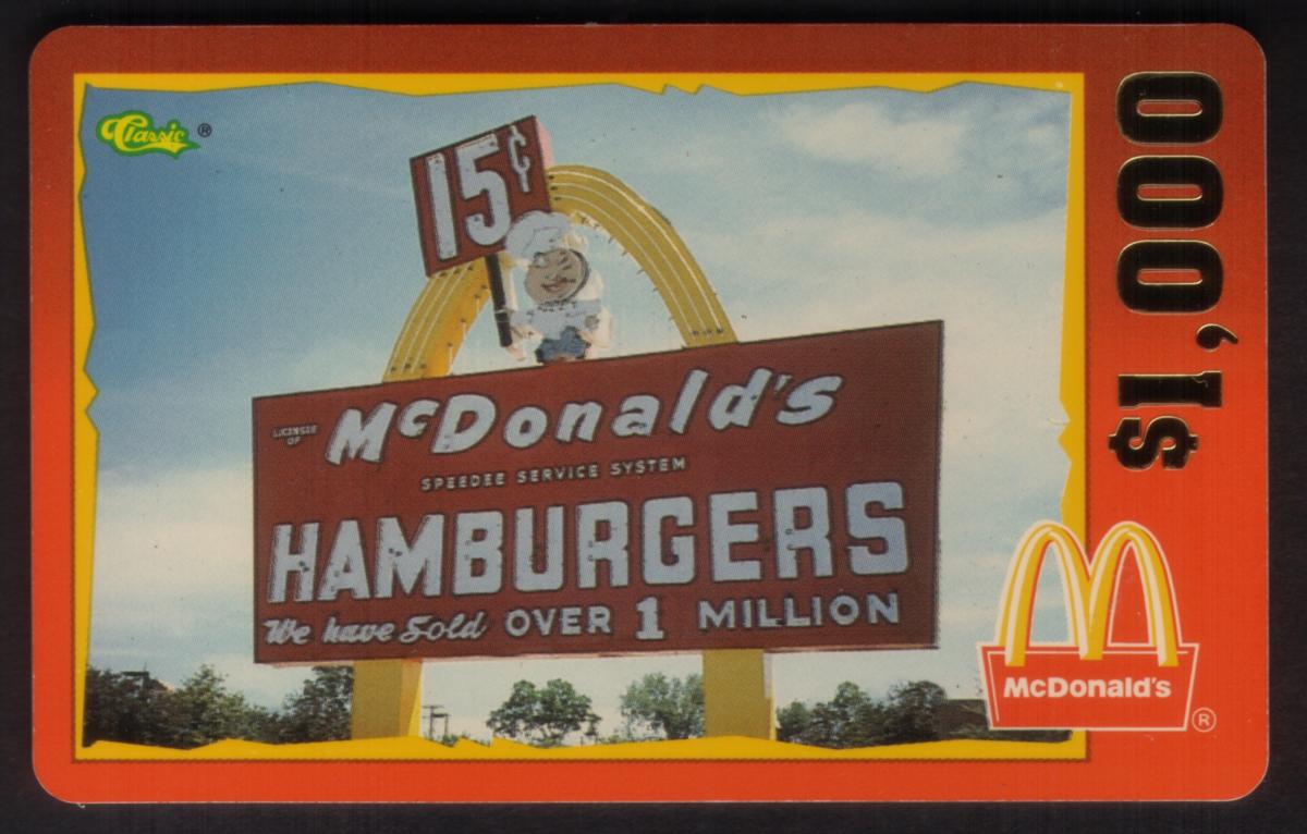 This phone card commemorates McDonald's as a pioneering fast food chain with a nostalgic highlight on one of its early iconic advertising signs from 1996. It captures the historical branding and iconic imagery associated with McDonald's restaurants and their Golden Arches logo.