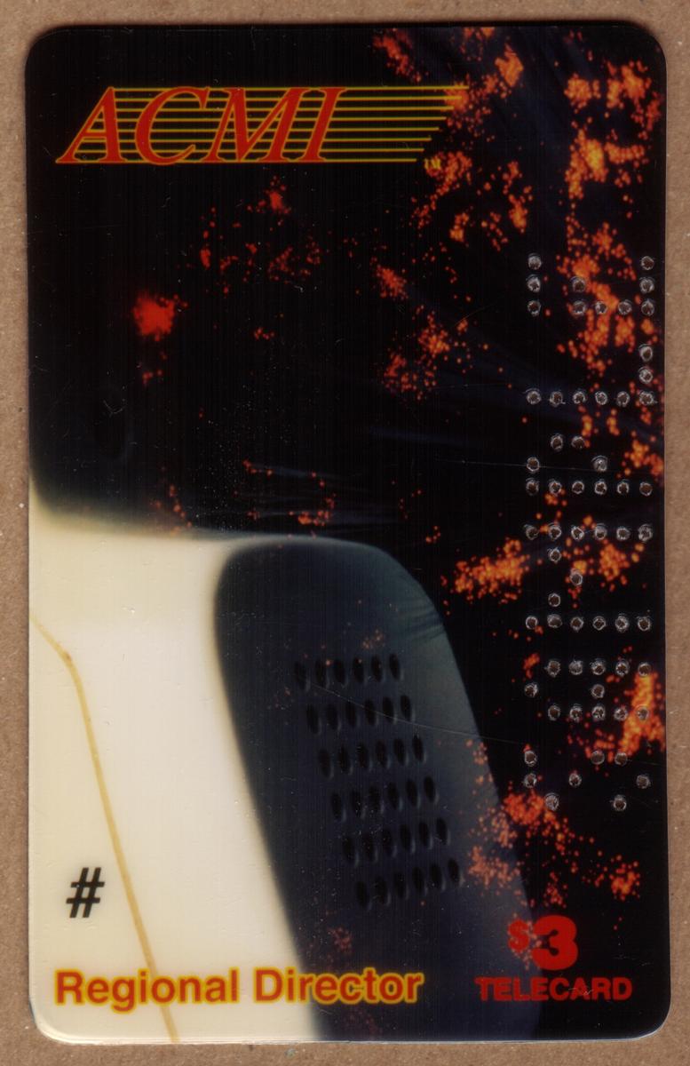 At the bottom of the card, "# Regional Director" is printed in orange, linking the card to a regional leadership role. The bottom right corner shows a "$3 TELECARD" denomination printed in red. The card is punched with the word "SAMPLE" vertically on the right side. The card includes keywords such as "user card," "instant long distance for less," "multi-level marketing $3," and "ACMI Regional Director," identifying it as a prepaid telecommunications card from ACMI.