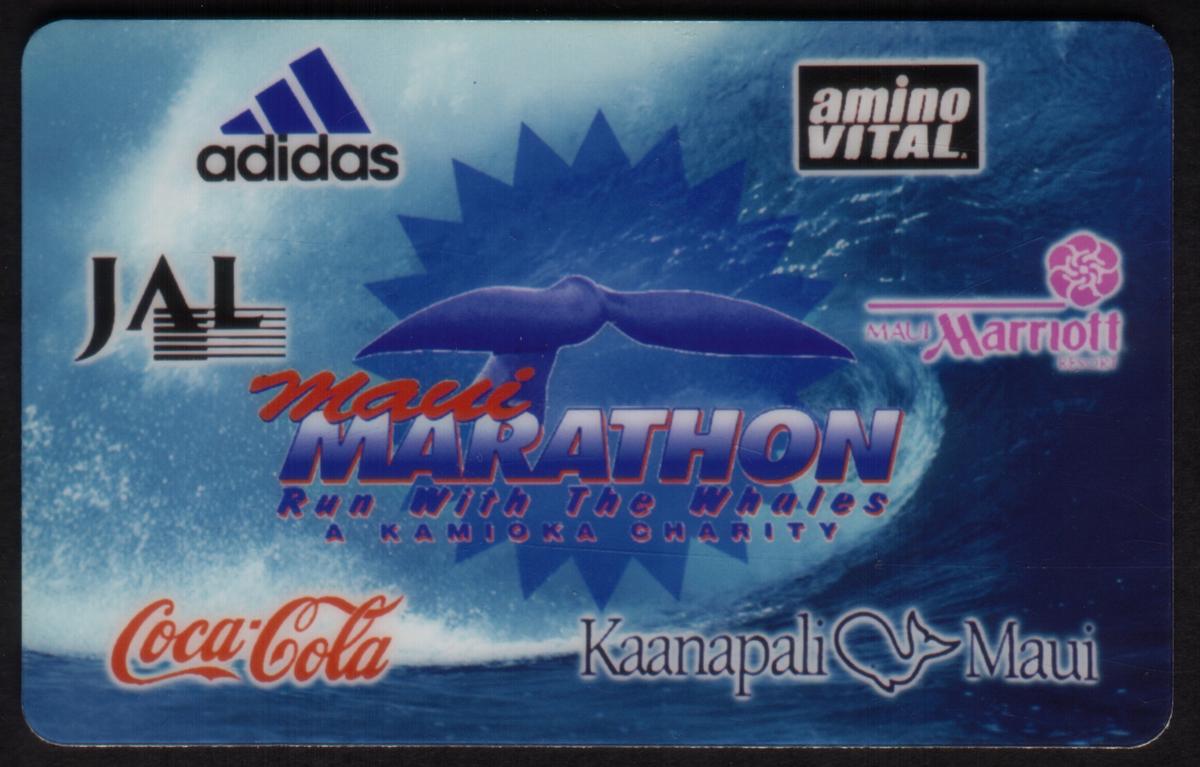 Maui Marathon 1998 phone card featuring ocean waves, marathon logo, sponsor logos, whale icon, and Hawaiian cultural elements. |