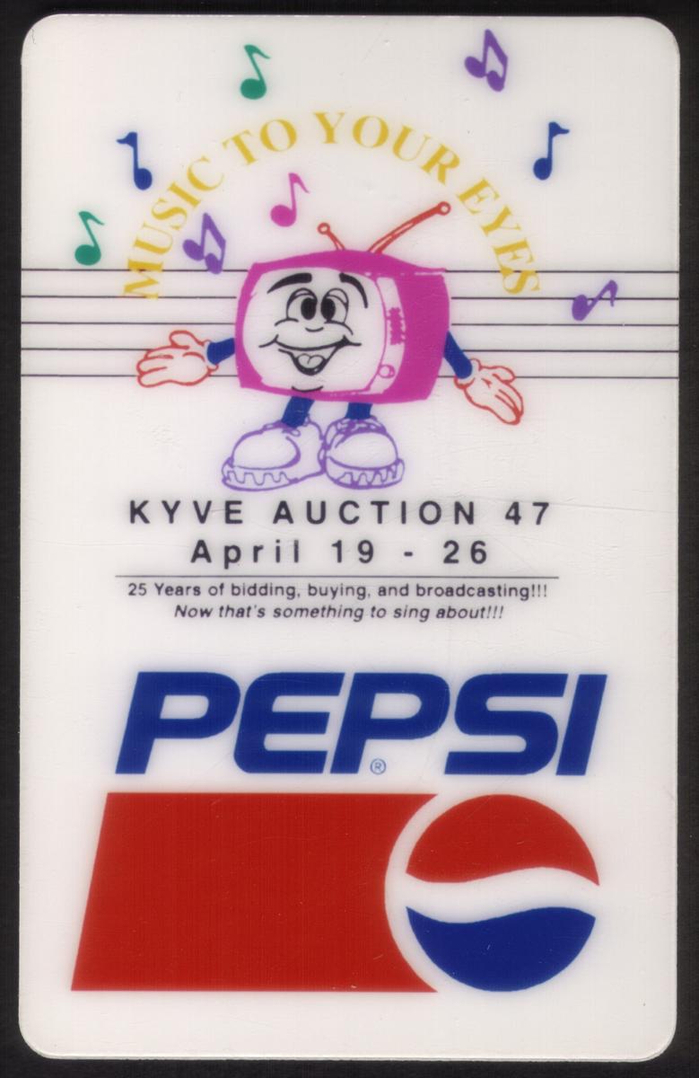 The card also contains advertising and trademark elements connected to the Pepsi-Cola brand, showcasing logos and brand names prominently. The text "Music To Your Eyes" appears as part of the card’s design, tying into a 1997 TV Auction titled "4/97 Large Pepsi Logo PROOF" associated with Grapevine Telecards. The card carries promotional significance related to music and television.