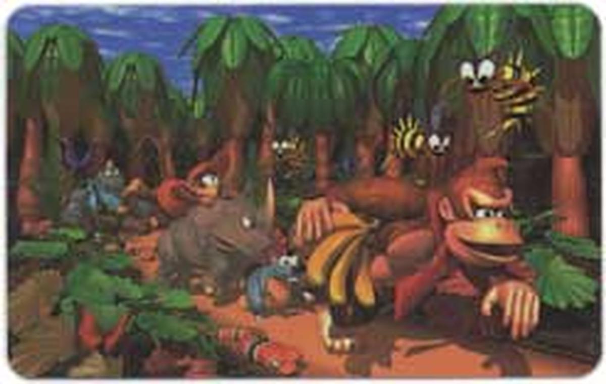 Vibrant Donkey Kong Country promotional card featuring animated jungle scene with characters, wildlife, bananas, and colorful 90s gaming artwork. |
