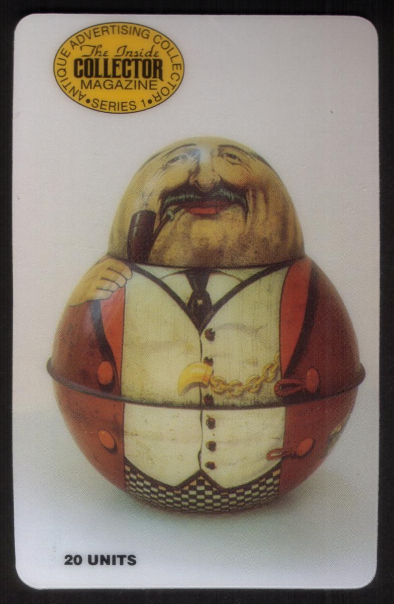 At the top left corner of the card, there is a gold oval emblem with black text that reads: "The Inside Collector Magazine - Antique Advertising Collectibles - Series 1 - No 1." This indicates the collectible nature of the item, tying it to a series and emphasizing its connection to antique advertising collectibles.