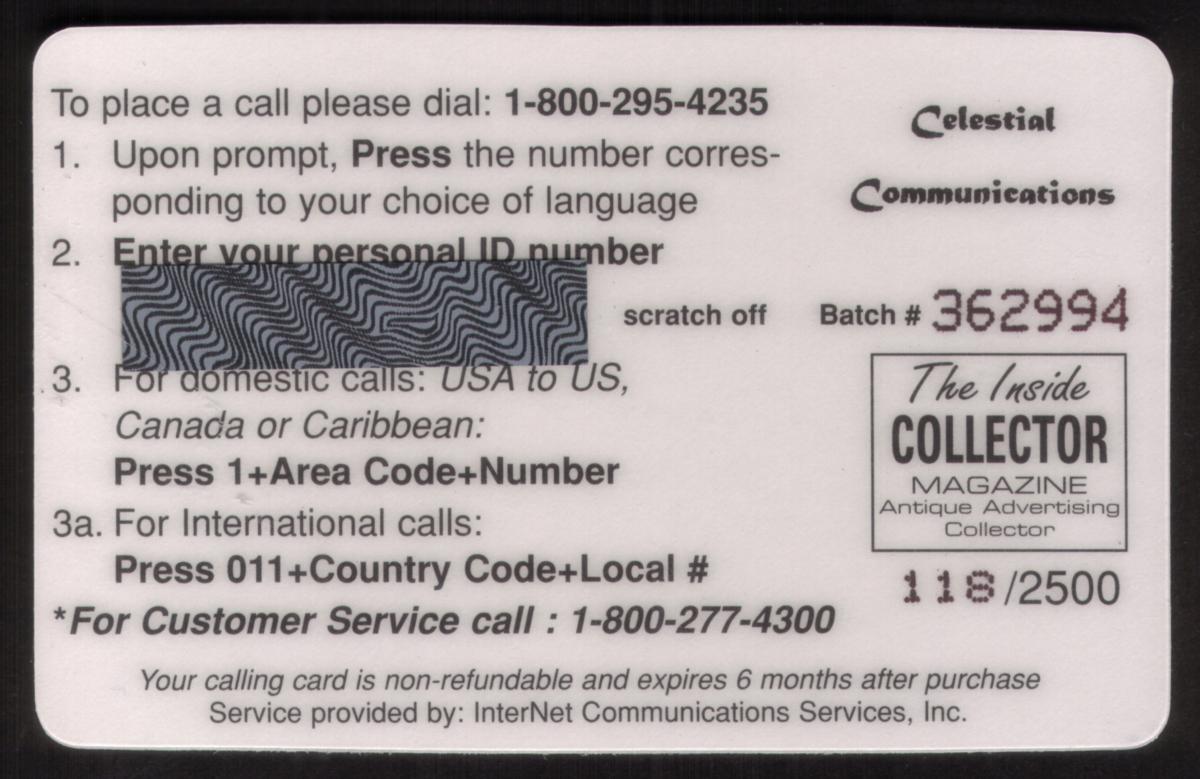 Since we have the world's largest inventory of USA phonecards for collectors, you will not necessarily receive the identical serial/batch/PIN number that we have scanned/pictured.