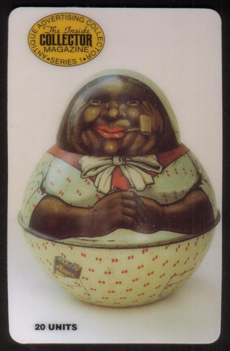 The top left corner of the card includes a gold oval emblem that reads “The Inside Collector Magazine” with the words "Antique Advertising Collectibles Series 1 Box 1" circling the emblem. Near the bottom left of the tin's image, the original tobacco tin bears a label with decorative script, adding to the antique aesthetic of the piece.
