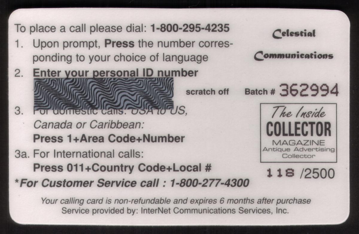 Since we have the world's largest inventory of USA phonecards for collectors, you will not necessarily receive the identical serial/batch/PIN number that we have scanned/pictured.