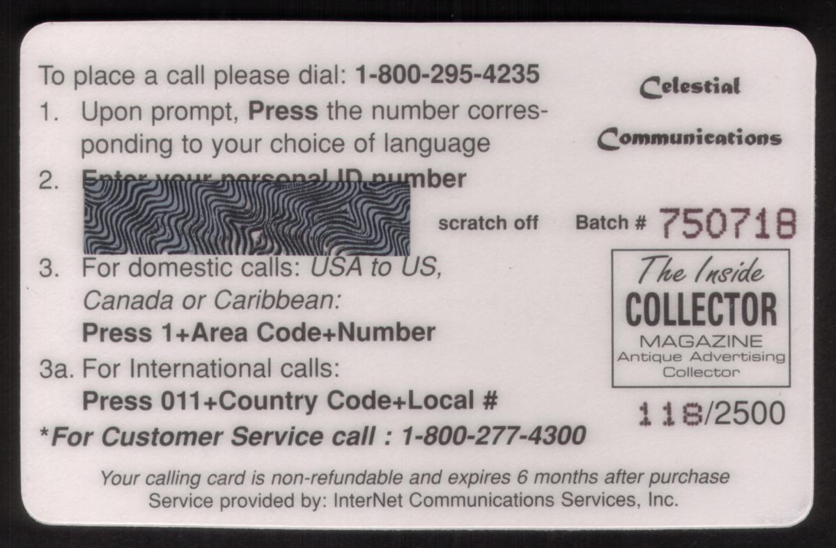 Since we have the world's largest inventory of USA phonecards for collectors, you will not necessarily receive the identical serial/batch/PIN number that we have scanned/pictured.