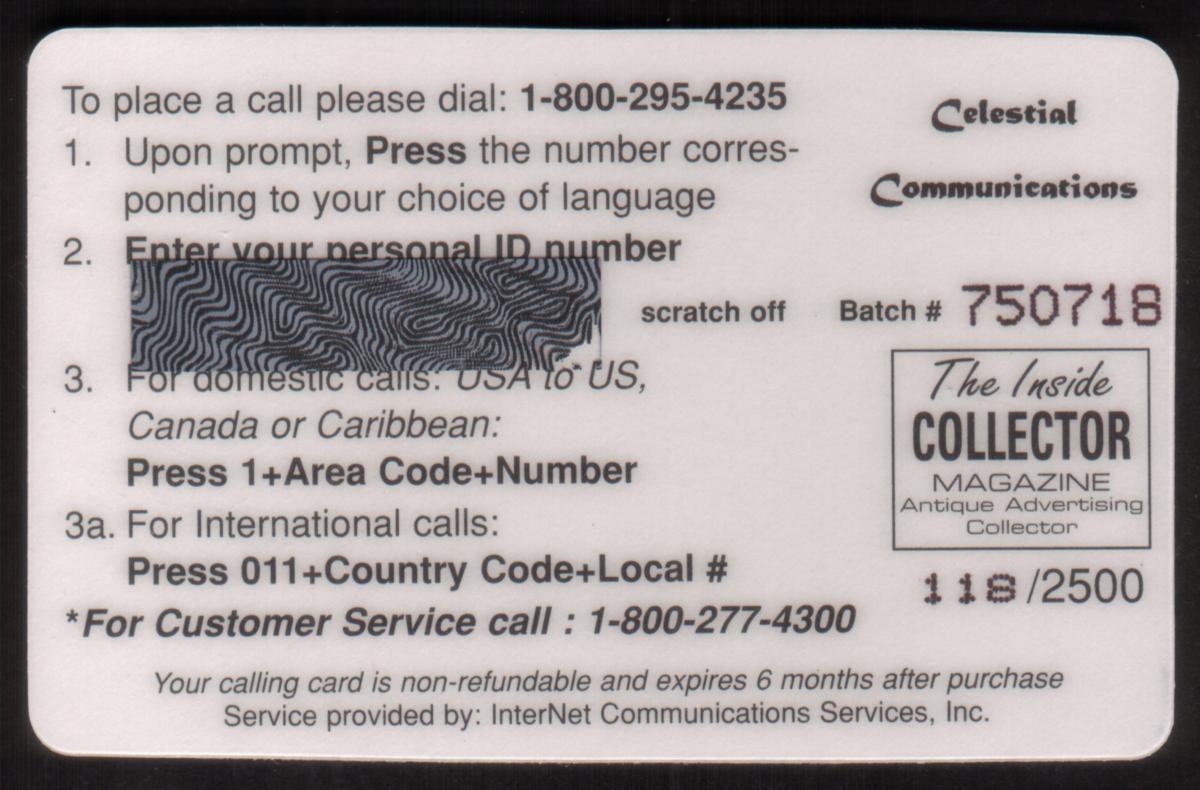 Since we have the world's largest inventory of USA phonecards for collectors, you will not necessarily receive the identical serial/batch/PIN number that we have scanned/pictured.