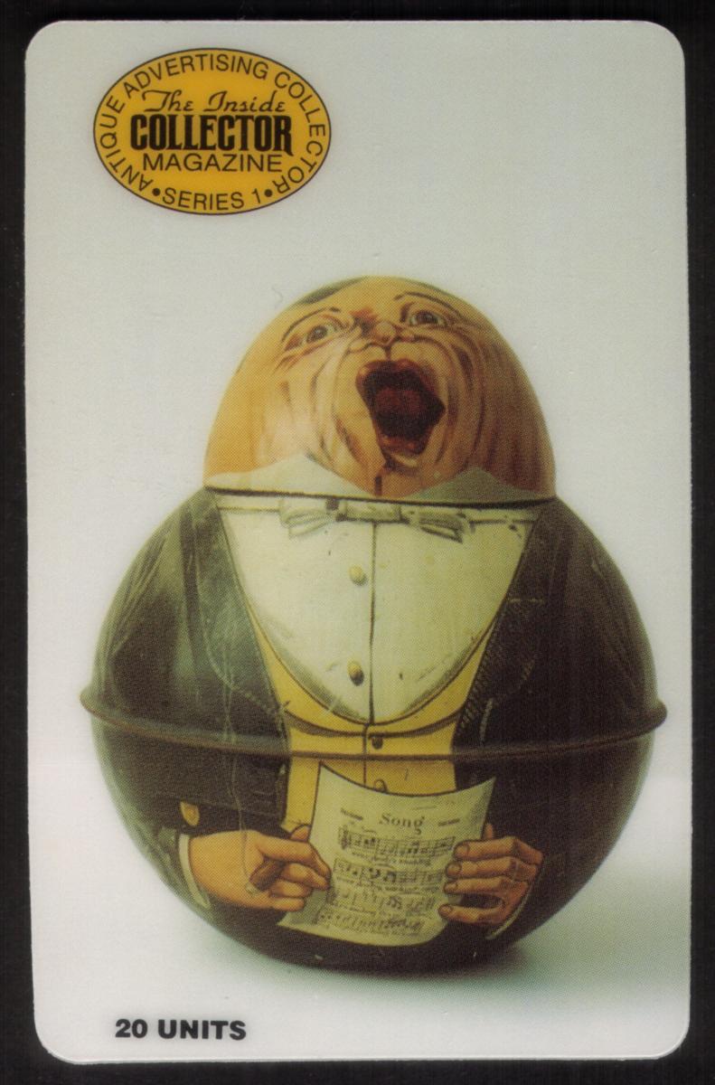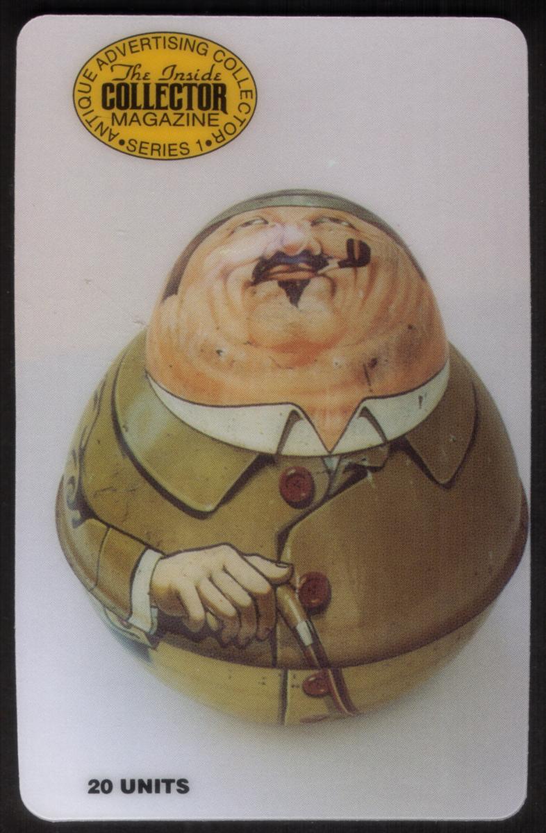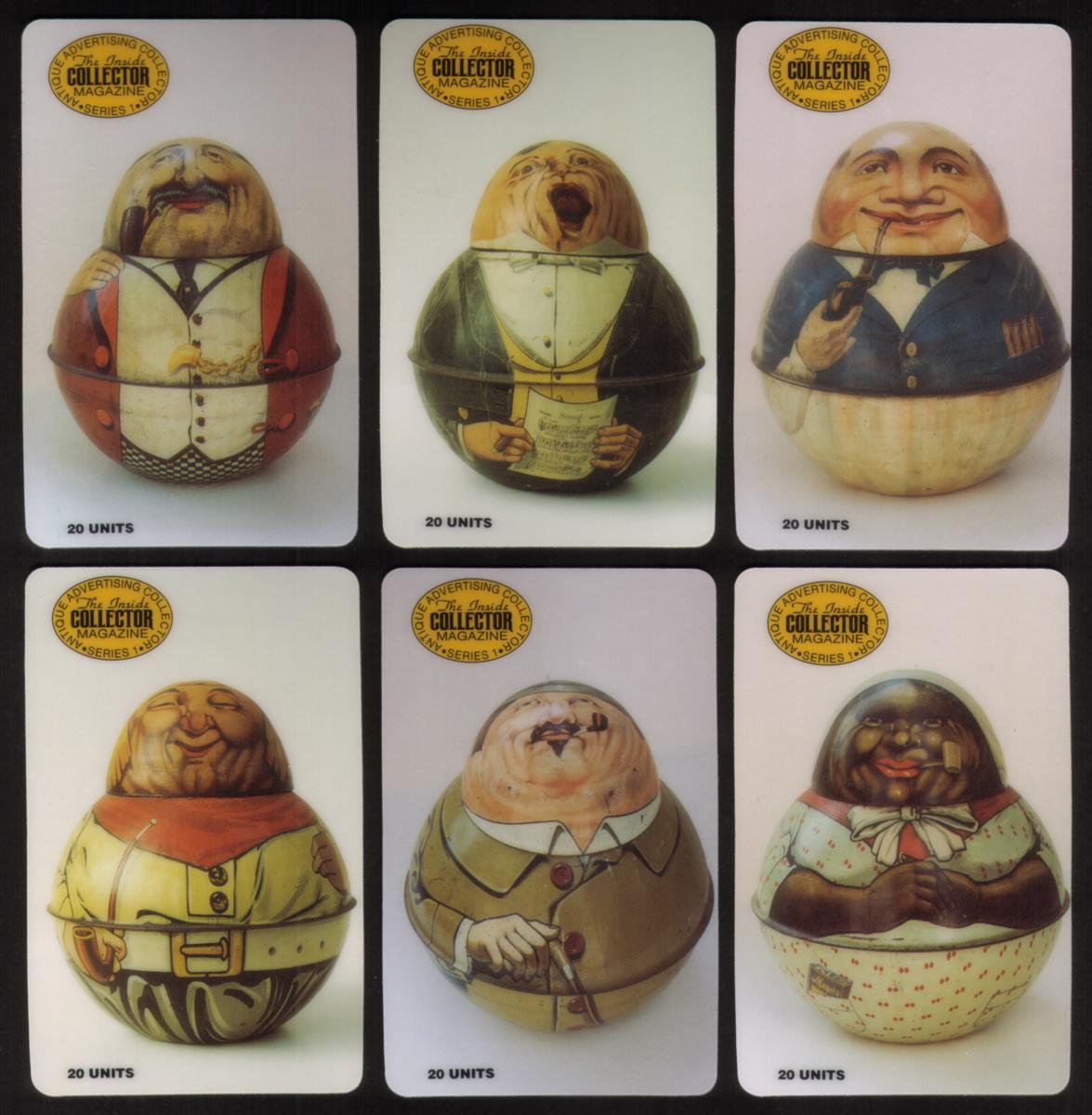 These six collectible phone cards each have a value of 20 units and belong to The Inside Collector Magazine Antique Advertising Collection, Series 1. Each card showcases a unique artistic depiction of a vintage tobacco tin shaped like a roly-poly doll. The illustrations are cartoonish and detailed, emphasizing characters associated with cigars and pipes, enhancing their antique charm and fantasy appeal.