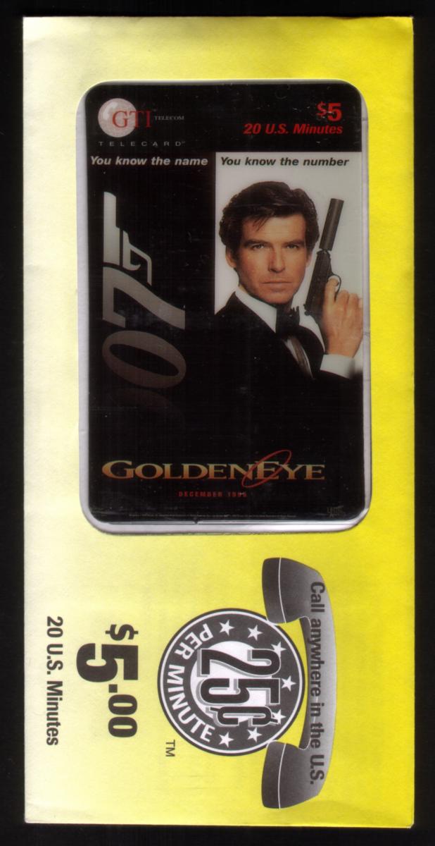 Vintage 1990s GoldenEye James Bond phone card featuring Pierce Brosnan, 20 minutes of talk time, collectible memorabilia, and iconic spy film imagery. |
