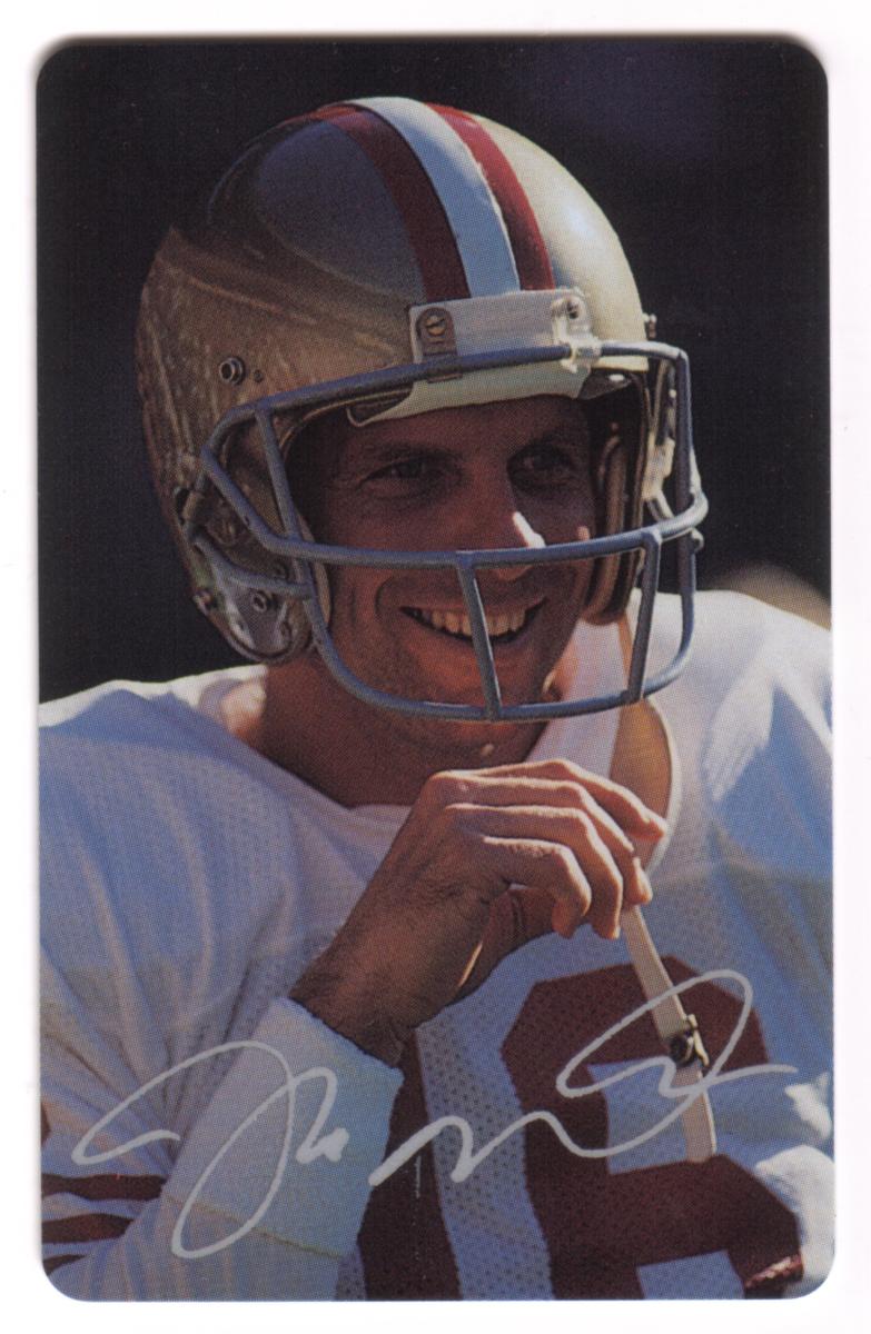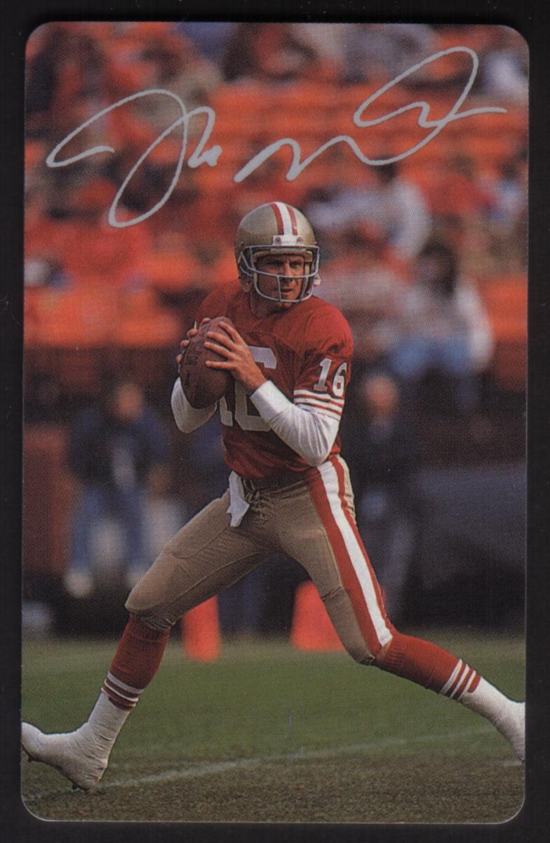 This complete set of five collectible football cards features Joe Montana, prominently known for his legendary NFL career. Four cards depict Montana in his San Francisco 49ers uniform, showcasing different game-action moments and poses. He wears the number 16 jersey and a gold helmet with a red stripe. Each of these four cards includes a facsimile signature of Joe Montana.