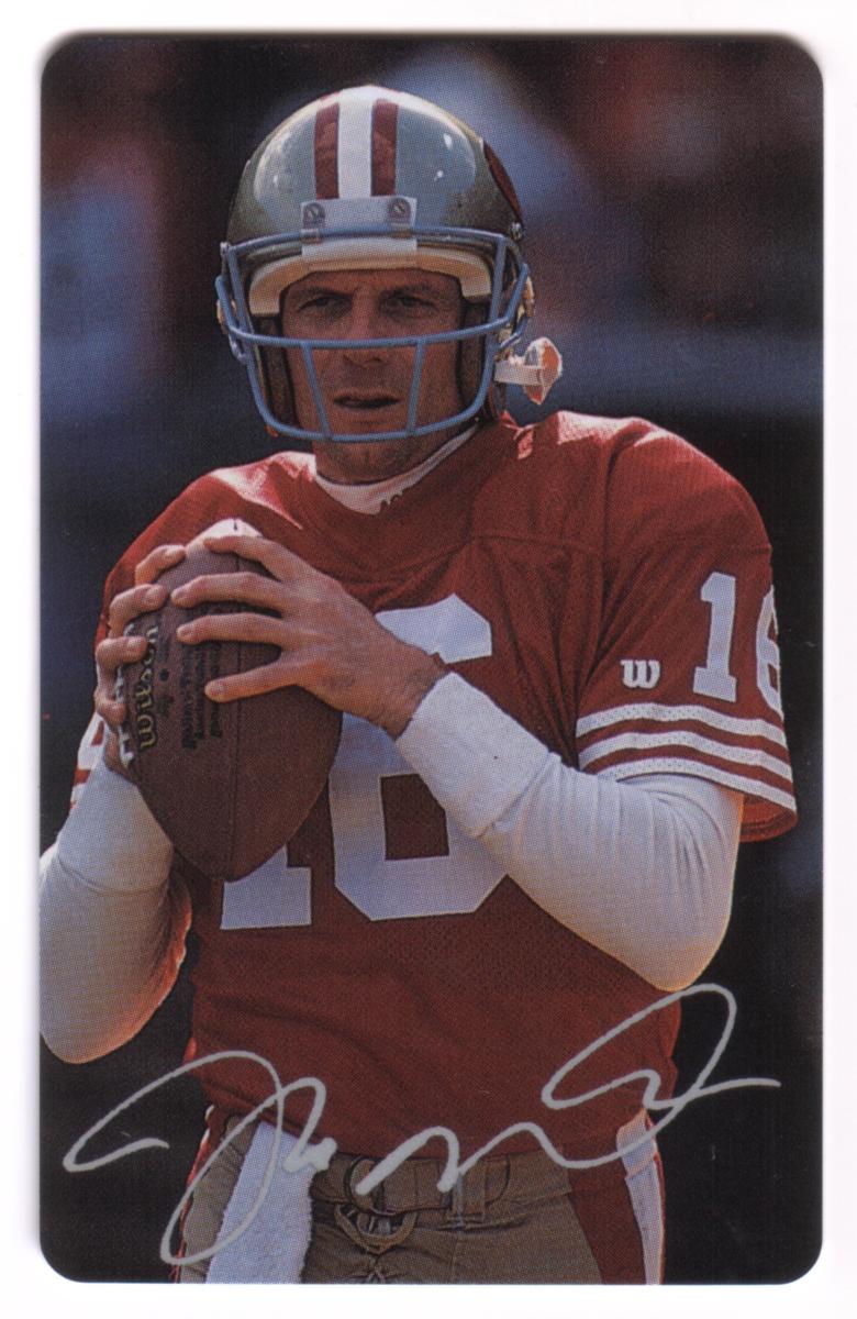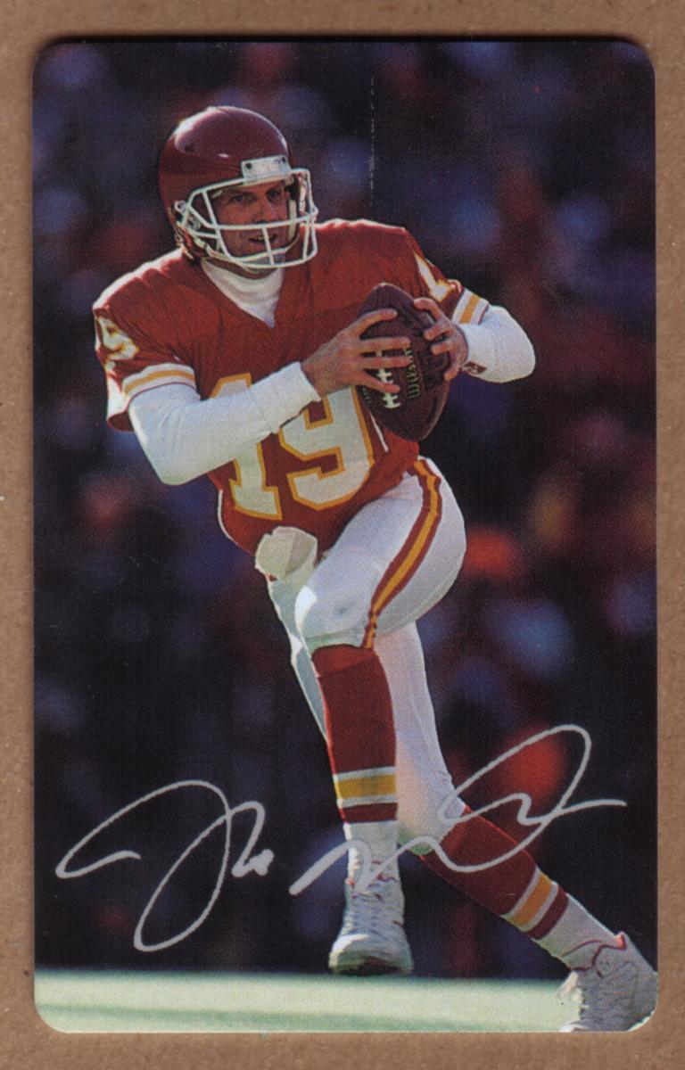 The fifth card highlights Joe Montana in a red Kansas City Chiefs uniform, wearing number 19. The photo captures him in a poised throwing stance during a game. This card also includes his facsimile autograph.