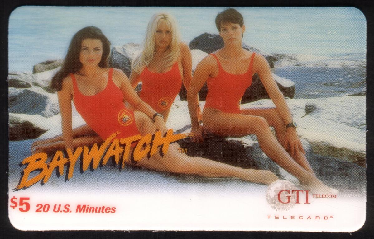 These collectible GTI Telecom telecards feature imagery from the TV show Baywatch, highlighting some of the main cast in distinct scenes. The first card shows five characters—three men and two women—on a beachside boardwalk setting. All are dressed in the iconic red Baywatch swimsuits associated with the lifeguard team, with the word "BAYWATCH" prominently displayed across the lower center. The denominations and minutes are noted at the bottom left as "$5 20 U.S. Minutes," with the GTI Telecom logo and the word "TELECARD" on the bottom right.