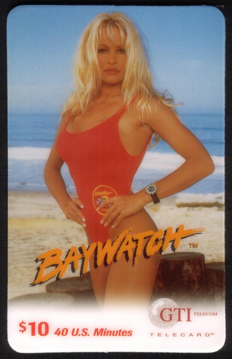 The fourth card features Pamela Anderson standing on a sandy beach, wearing her red one-piece Baywatch swimsuit. She faces the camera with her hands on her hips. The card shows "BAYWATCH" text in orange centered near the bottom, "$10 40 U.S. Minutes" printed in red on the lower left, and the GTI Telecom logo with "TELECARD" on the lower right edge.