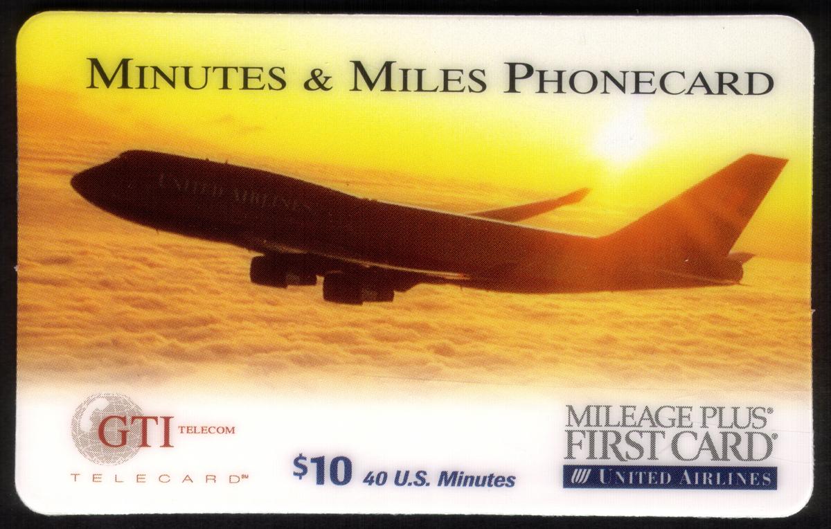 The card includes printed text identifying it as the "$10 United Airlines Mileage Plus First Card," linking it to United Airlines and its Mileage Plus frequent flyer program. The name "GTI Telecom, Inc." also appears, indicating the telecommunications company associated with the card. The combination of imagery and text highlights the themes of aviation, airlines, and passenger travel.