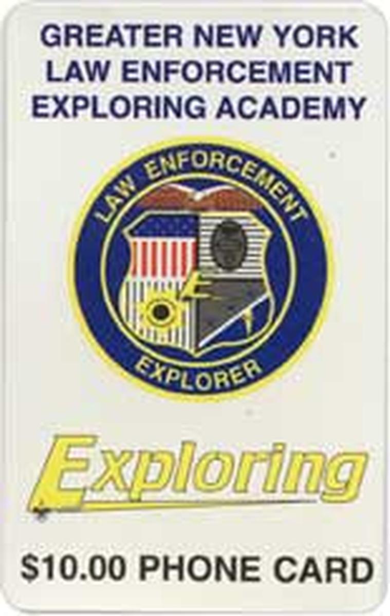At the top left corner of the card is the logo of Public Switch Corporation, and a prominent "$10" value is shown near the top right, indicating the card's denomination. The text "Boy Scouts Greater New York Law Enforcement Exploring Academy" is clearly printed near the bottom center. Additional text "Global Key (Public Sw)" appears beneath this title, identifying the issuing or associated organization.