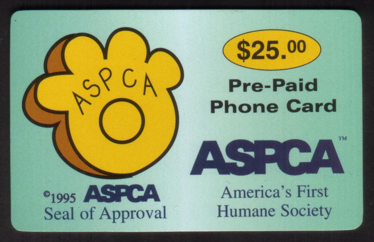 This is a $25.00 pre-paid phone card issued in 1995 featuring the American Society for the Prevention of Cruelty to Animals (ASPCA). The card prominently displays a yellow paw print with the letters "ASPCA" inside it on a light blue-green background. Below the paw print, the text reads "©1995 ASPCA Seal of Approval."