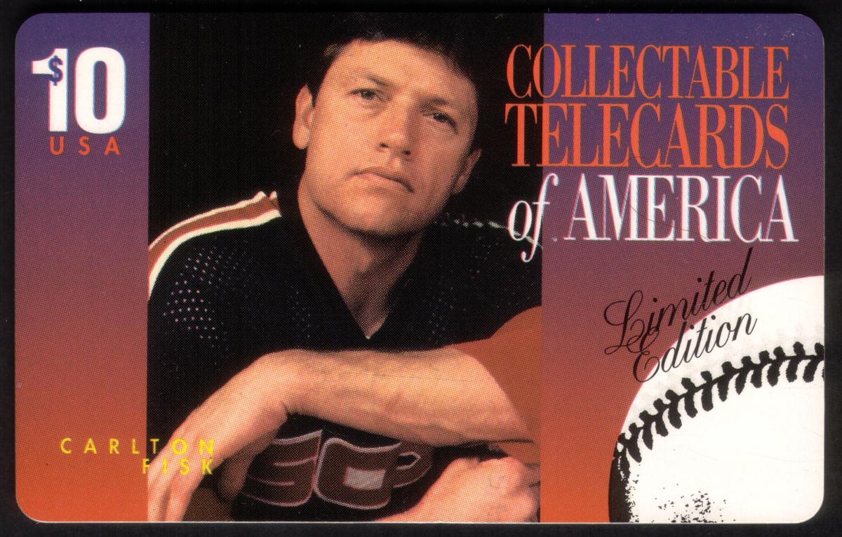The front of the card includes text that reads “$10” and “Carleton Fisk Baseball,” identifying both the card’s value and the featured athlete by name. The overall layout and printing quality reflect its use as a collectible item related to baseball. The card’s surface shows vivid colors and clear typography, highlighting the sports theme tied to the player and the game of baseball.