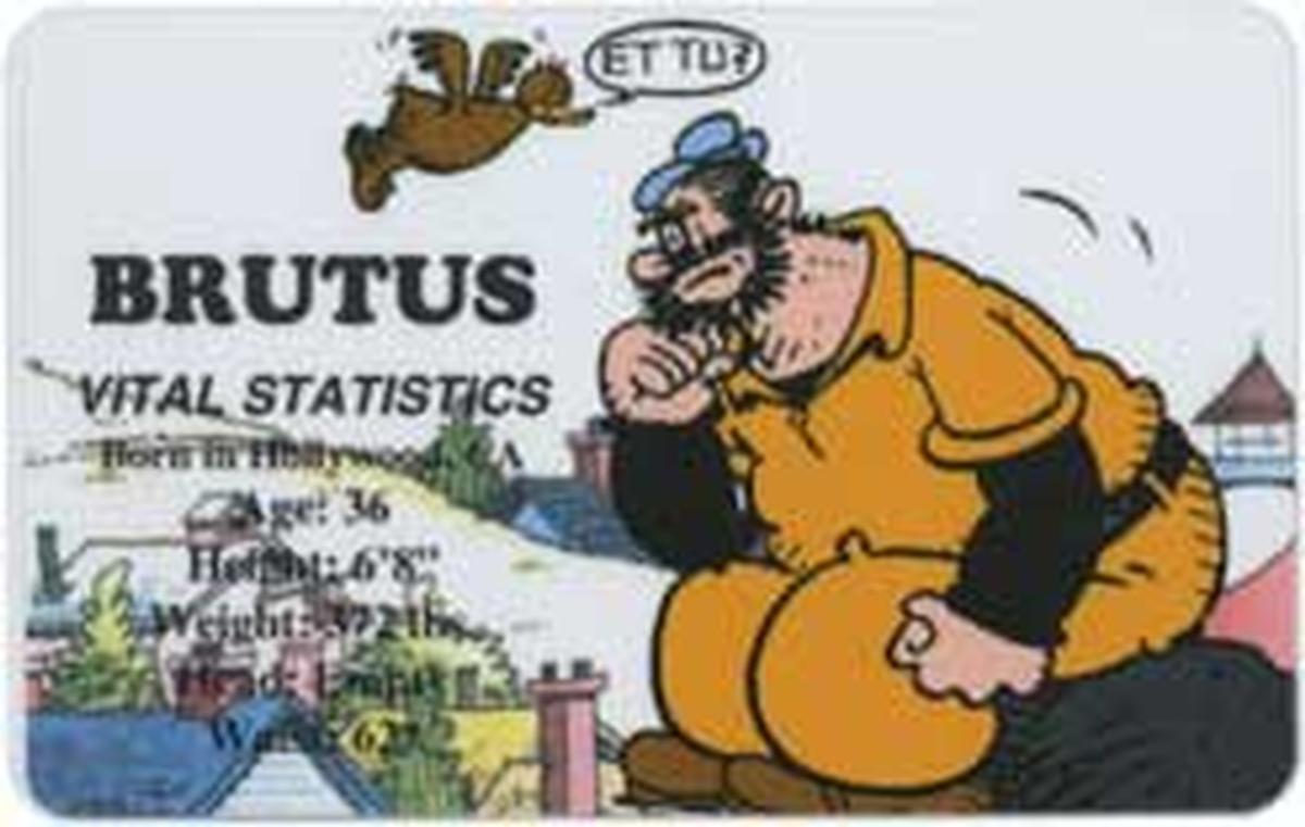 This card is a collectible item related to cartoons, comics, and animation, specifically highlighting the classic Hollywood California-based character Popeye and his adversary Brutus. It blends elements from comic strips and animated series, capturing the timeless appeal of these figures from American pop culture.