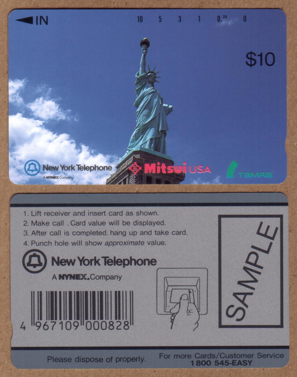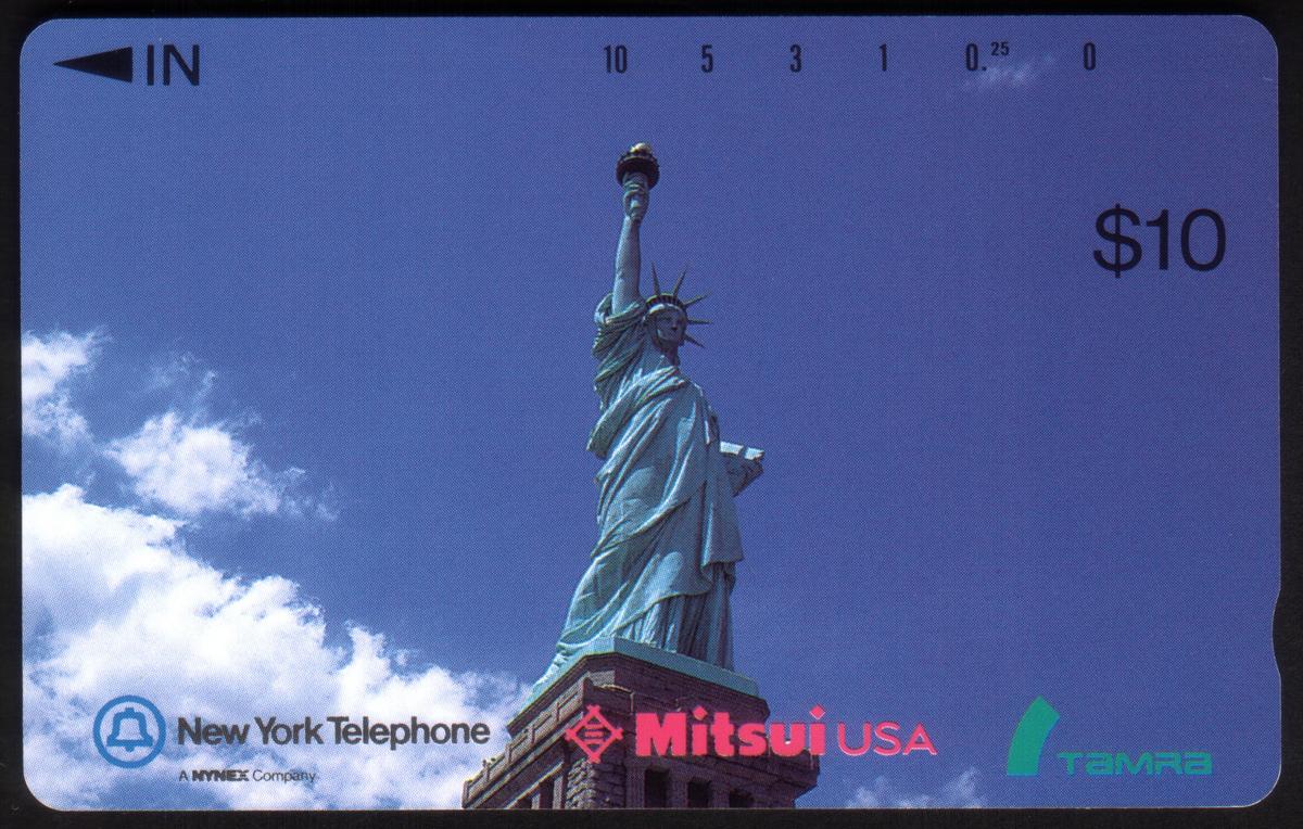 This phone card highlights American historical landmarks and American icons, specifically focusing on one of the nation’s key national monuments, the Statue of Liberty. It reflects themes of Americana and American history, with strong ties to New York City. The collaboration between New York Telephone, Mitsui USA, and Tamra is clearly marked, emphasizing its origin and authentic use for telecommunication within the region.