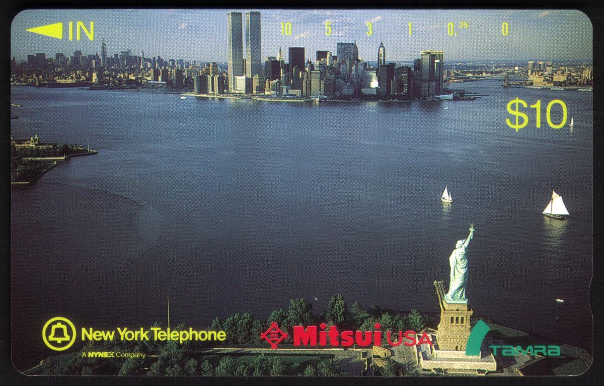 Collectible phone cards featuring iconic New York Harbor views, Statue of Liberty, World Trade Center towers, and Manhattan skyline, pre-2001. |