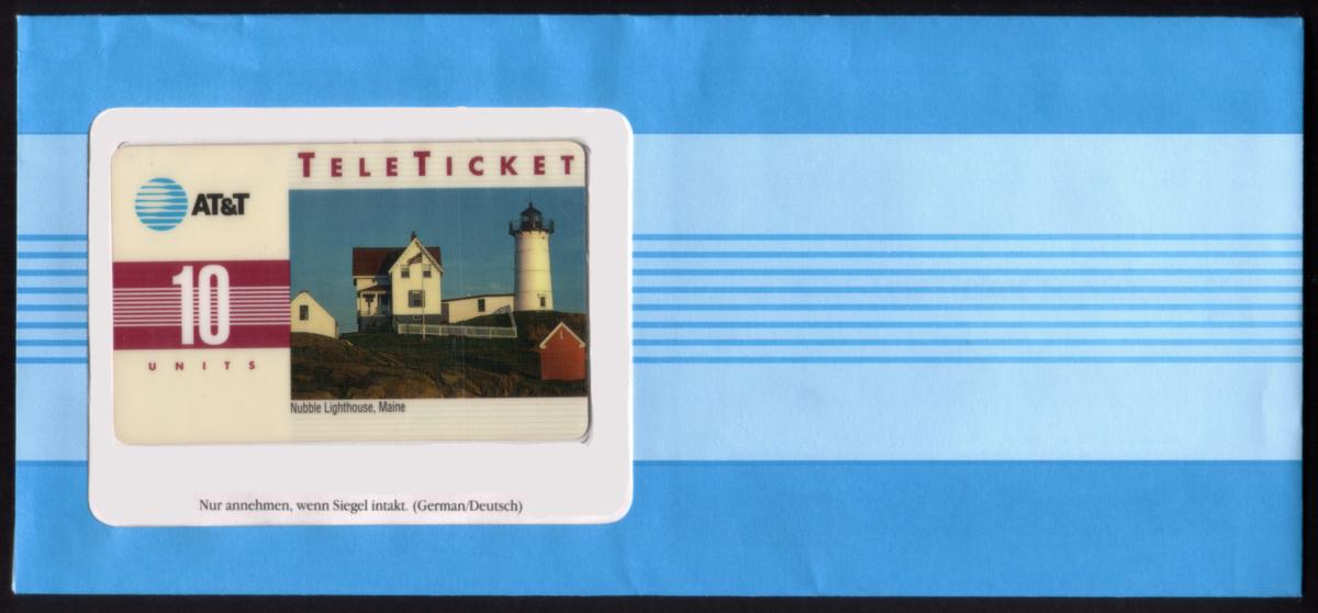 This AT&T Teleticket collectible phone card features a detailed photographic image of Nubble Lighthouse in Maine. The image showcases the iconic white lighthouse tower alongside the attached keeper's house with a red roof, all set against a clear blue sky. The lighthouse is situated on a rocky outcrop, with the house and surrounding structures clearly visible.