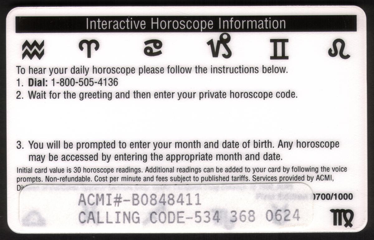 This set of twelve collectible prepaid astrology cards by ACMI features a complete series representing each zodiac sign with its symbol, date range, and a unique color background. Each card includes the words "PREPAID ASTROLOGY" at the top with "30 READINGS" indicated on the upper right. The zodiac symbol is prominently displayed in black silhouette in the center against the vibrant colored backdrop. Below the symbol, each card clearly states the zodiac name in bold capital letters and includes the appropriate date range associated with the sign.