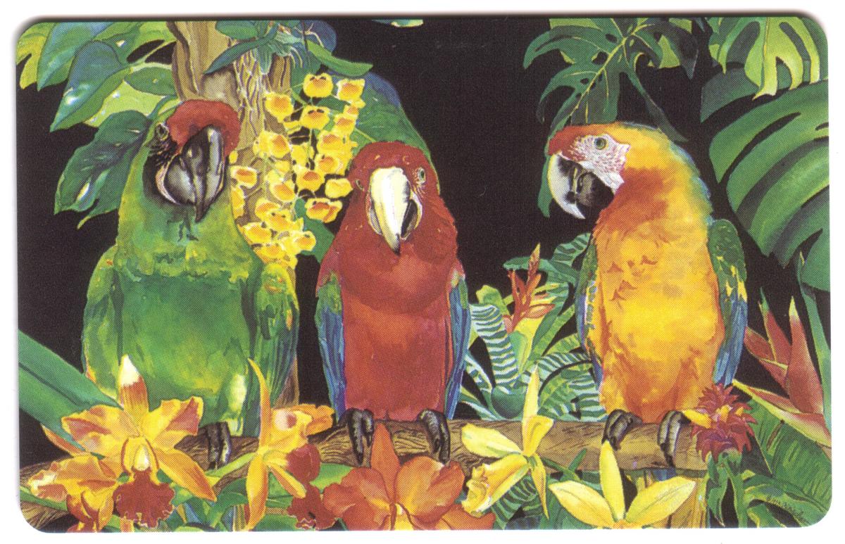 The front of the card includes the words "Three Colorful Parrots In Jungle Setting (Art by Flippen)" and is part of a set that highlights birds and animals in artistic format. PhonLynx is also mentioned, associating the card with this entity. The overall presentation celebrates the beauty of parrots and orchids in a tropical environment through fine watercolor artwork.