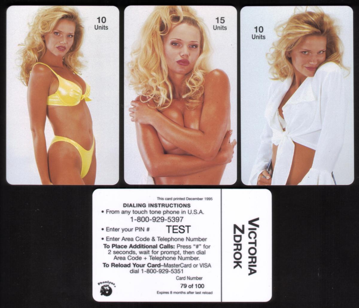 These collectible phone cards feature Victoria Zdrok, known for her work as a Penthouse and Playboy model. Each card displays a different image of Victoria in varied attire and poses.