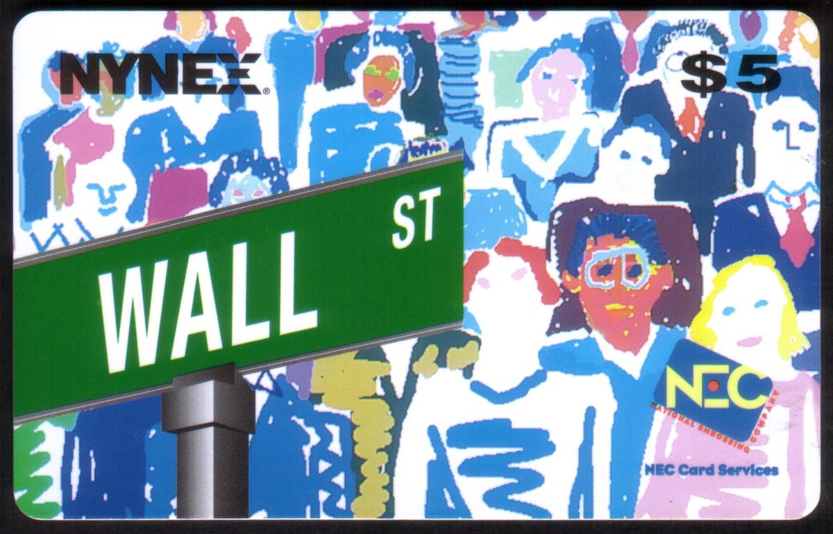Additional text on the card identifies "NYNEX," indicating the phone card issuer, and includes branding elements associated with telecommunications tied to New York. The card’s design integrates these elements seamlessly to create a collectible representative of Signs of The Times, specifically Wall Street’s cultural and economic importance within one of the world’s leading metropolitan areas. The card’s $5 denomination is noted on the front, marking its value for use.