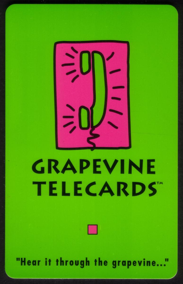 The card’s artwork includes a stylized depiction aligned with the promotional theme, showcasing an artistic arrangement that includes the 3M logo and distinctive graphics related to the Grapevine Telecards brand. The design highlights the card’s function as a phone card while promoting the brand and its messaging from the late 1990s.
