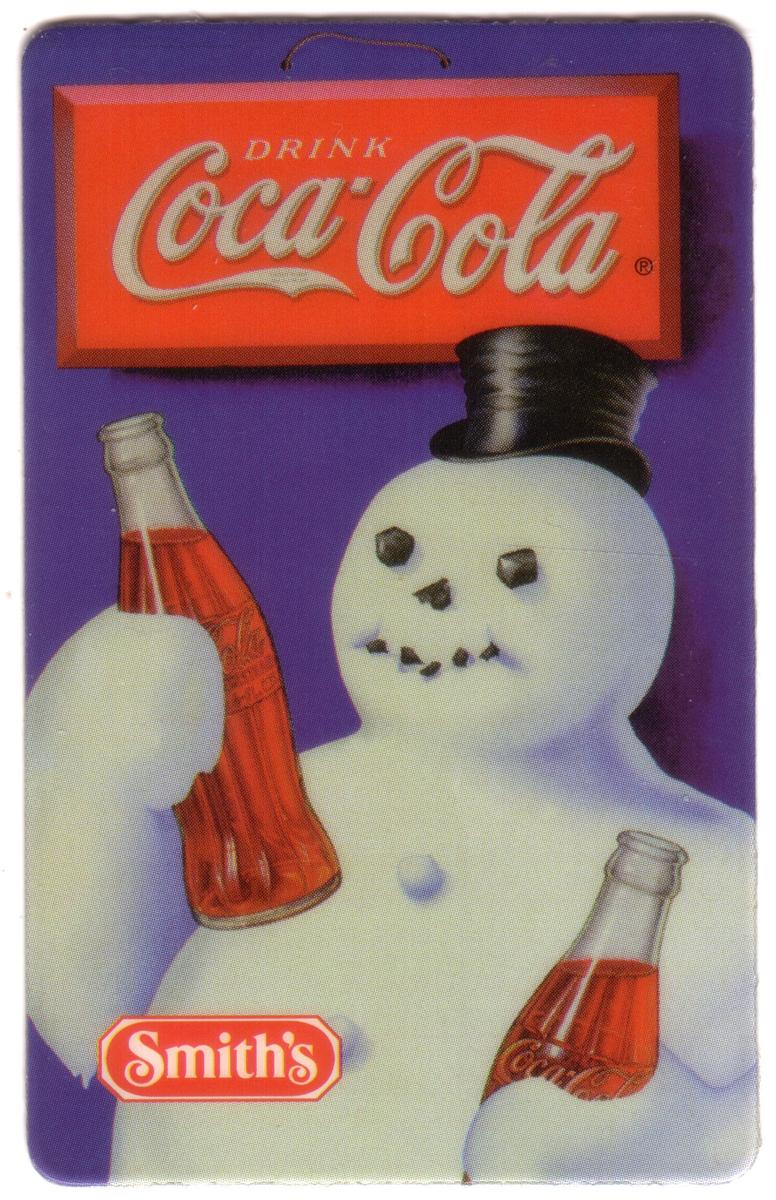 Overall, the card combines holiday imagery with prominent Coca-Cola branding and marketing details, making it a collectible item tied to Coke advertisements. The design is clean, with bright colors and recognizable branding elements centered around the snowman holding the two Coke bottles.