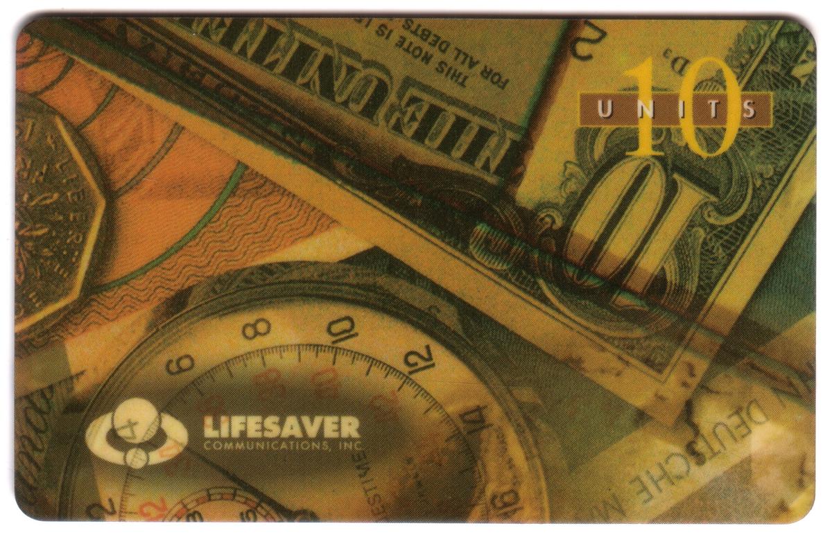 The card combines elements of both communication and money, as indicated by the inclusion of "LifeSaver Commun.," "WorldCom," and "Stop Watch," alongside the realistic $10 bill image. This collectible highlights the intersection of phone services or communications and currency, making it distinct within collections related to coins, currency, and numismatics.